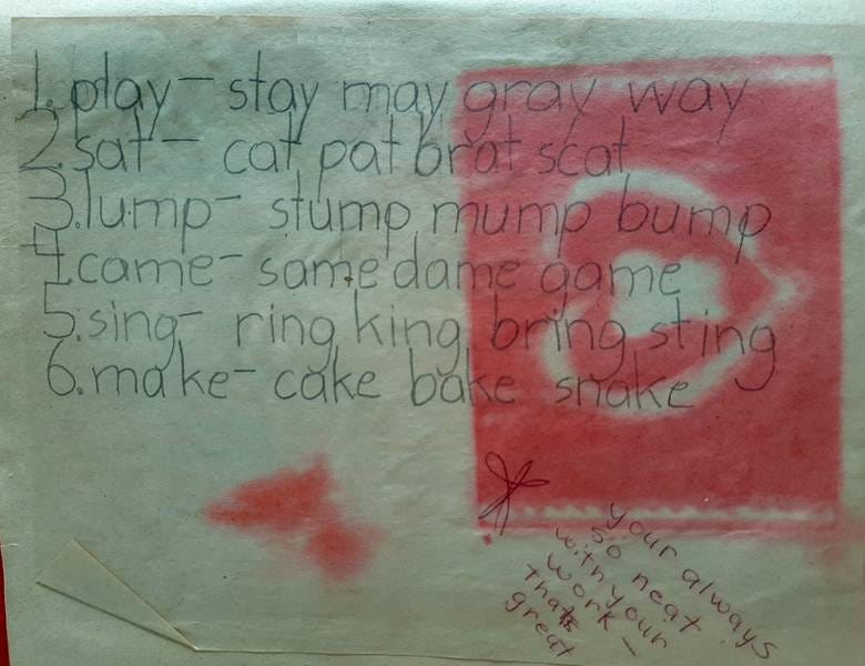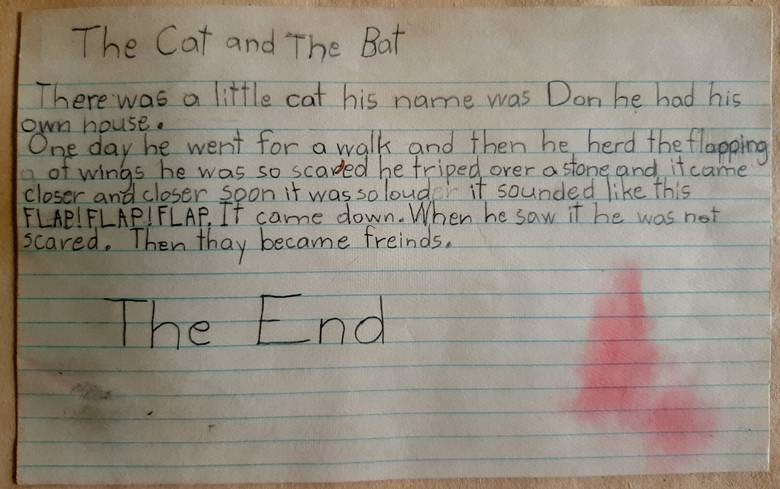 If you’re wondering how I got my start in writing, as soon as I learned to print, I wrote my first story, “The Cat and the Bat,” on a 3 X 5 index card. You can see that I included important elements of drama and suspense. If only my recent writing were as exciting. There are mortifying spelling and grammar errors I can’t repair now, but you can see that I was already editing my writing as I erased the “er” from “loud.” The story also features a classic happy ending, reminiscent of my hopes expressed in the essay “On Imagining.”