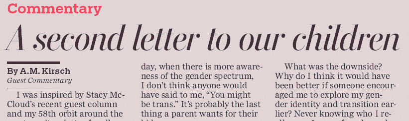 I subscribed to the local paper and scoured its archive for trans stories, discovering that there really weren’t any to speak of, probably due to the conservative politics of Northern Colorado. But I kept reading the paper to immerse myself in the city’s culture, and soon came across an opinion column in the paper entitled “A Letter To Our Children,” where the writer said: